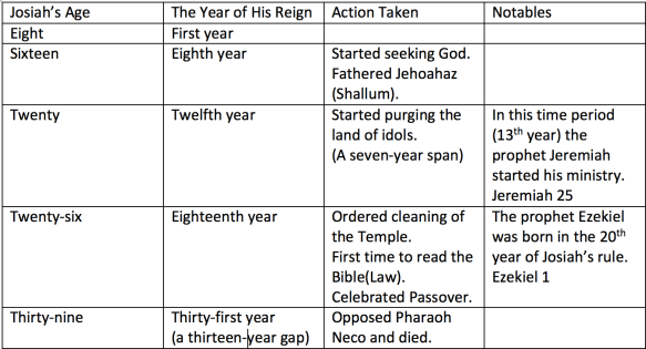 I have done several posts about numbers, so I will refer to them. The numbers do highlight the prophetic nature of Josiah’s life.